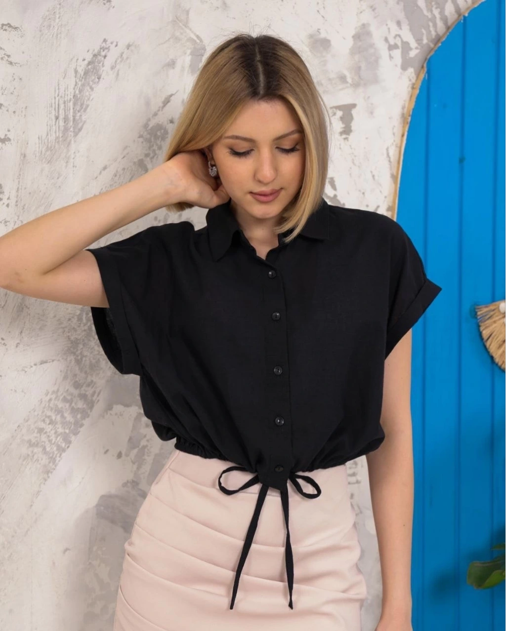 • Sıfır kollu bağlamalı crop gömlek siyah s255359