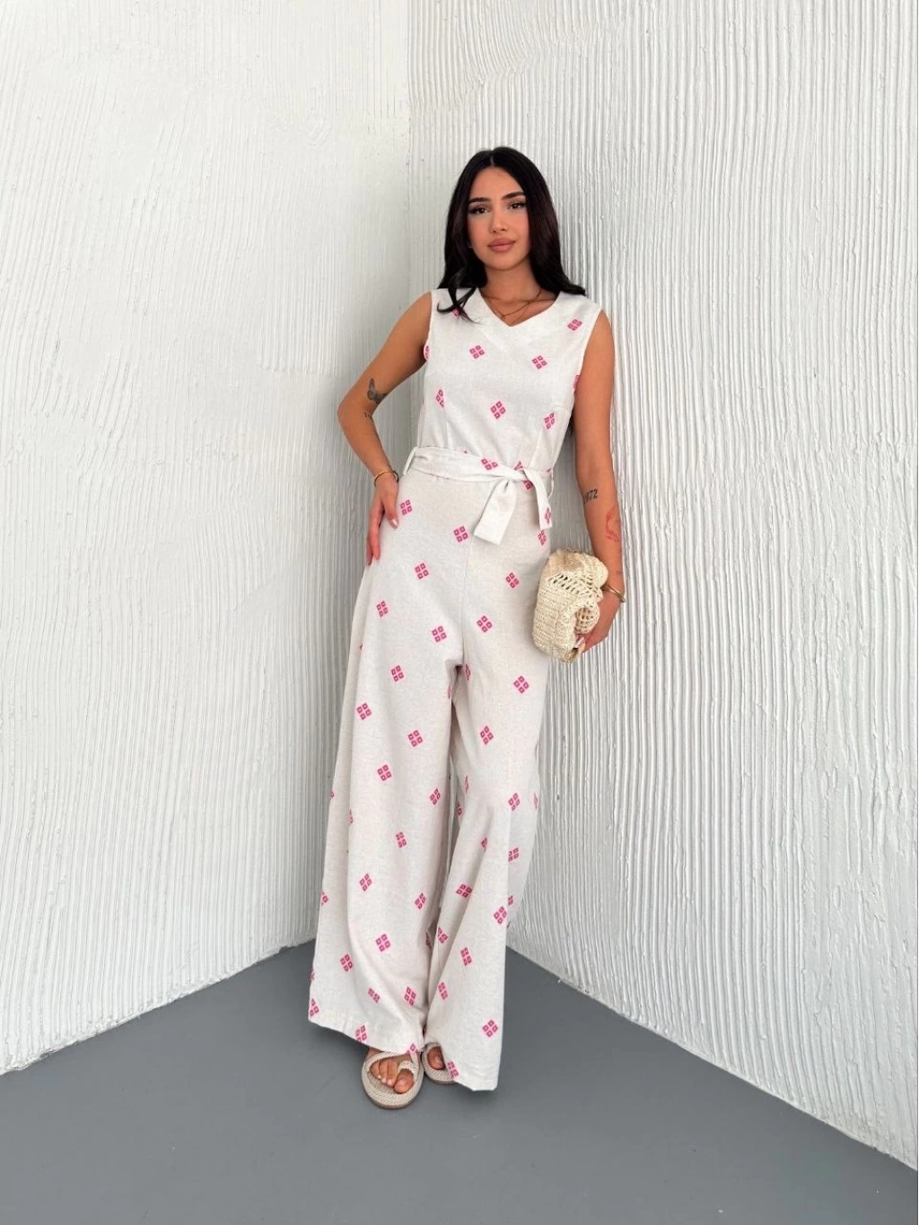 Sırt dekolteli keten beyaz tulum, gardırobunuzun şıklığını tamamlayacak harika bir seçenektir.