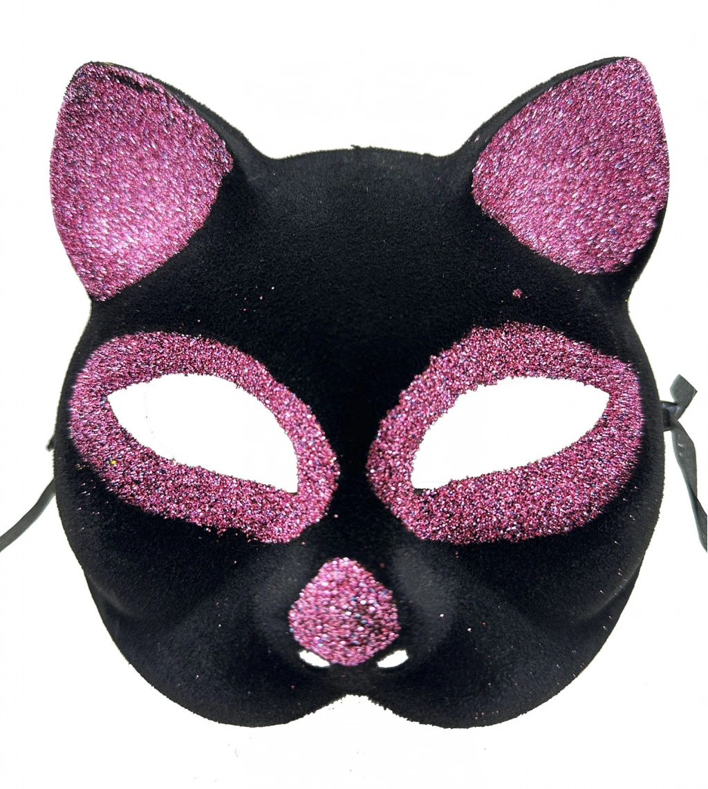 Balolar ve özel günler için mükemmel bir aksesuar olan Siyah Renk Pembe Simli Süet Kedi Maskesi ile göz kamaştırın!