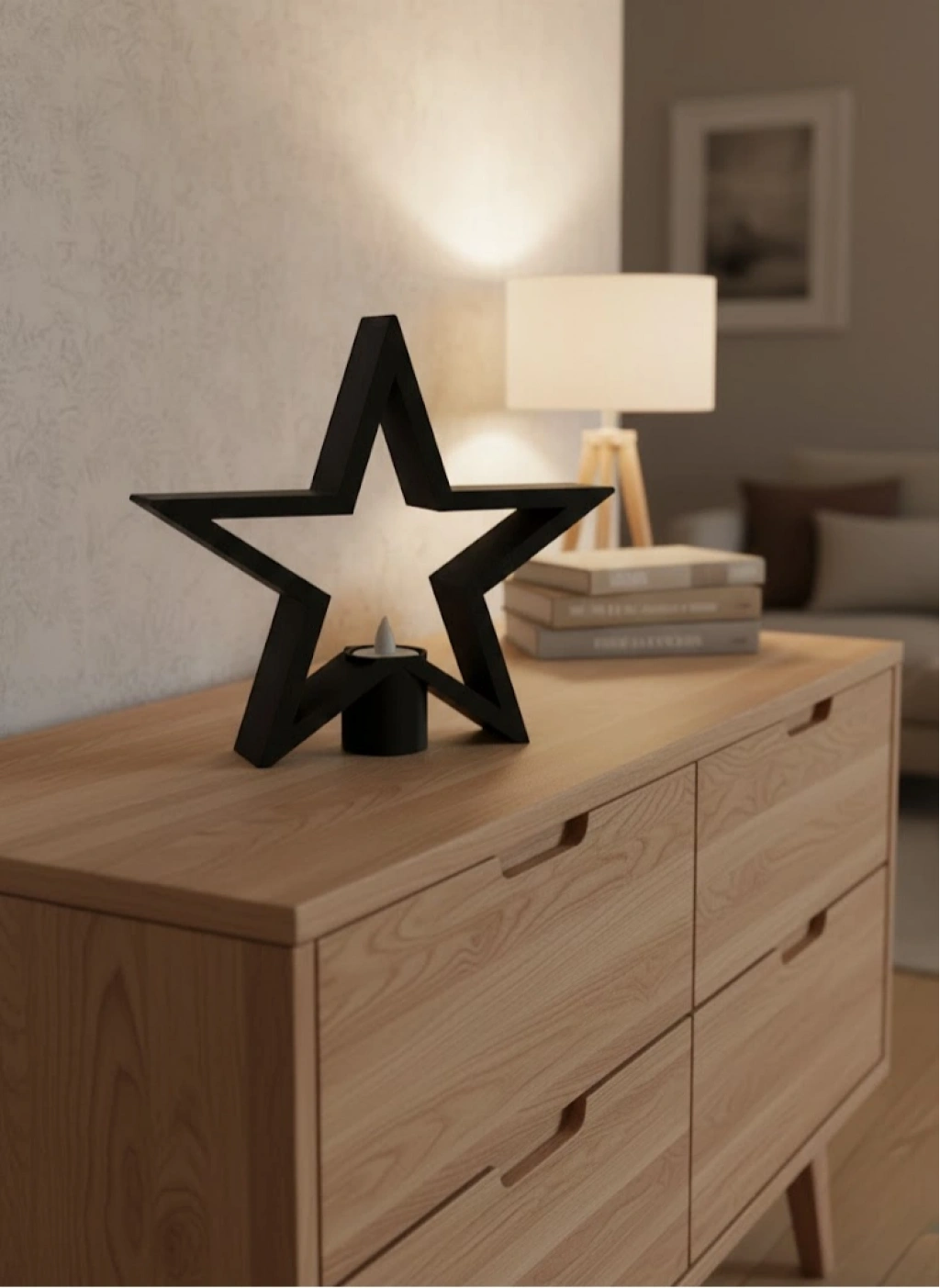 Geometrik yıldız tasarımıyla öne çıkan siyah mumluk, yaşam alanlarınıza modern bir dokunuş katar. Mum yerleşimi sayesinde yumuşak ve huzurlu bir ışık yayarak akşam saatlerinde rahatlatıcı bir ortam sunar. Minimal çizgileri sayesinde İskandinav, modern ve endüstriyel dekorasyon stilleriyle uyumludur. Günlük kullanımın yanı sıra özel gün dekorasyonu için de idealdir.