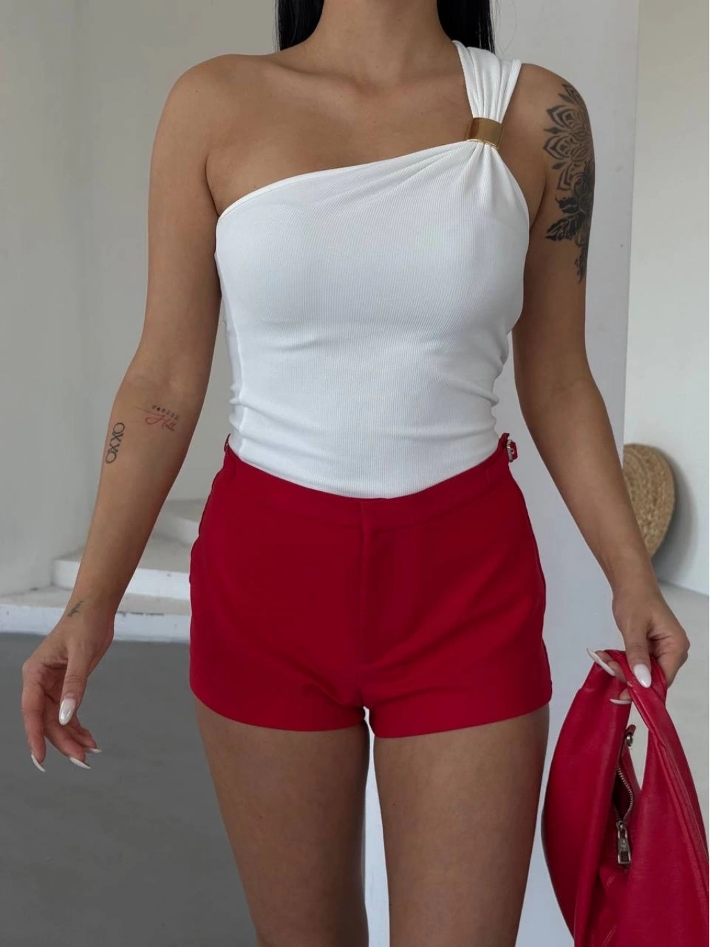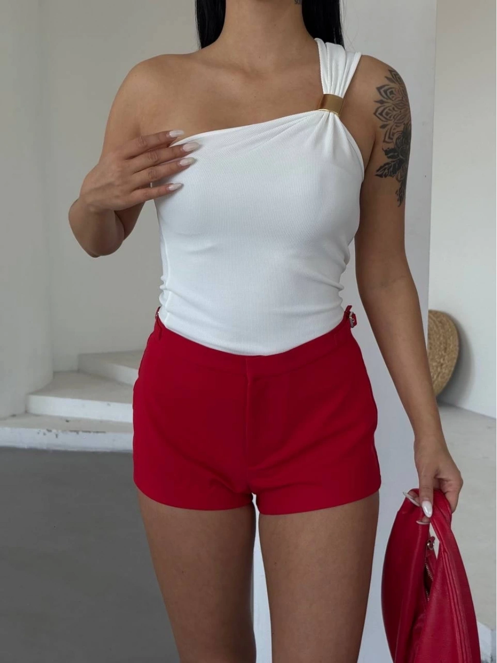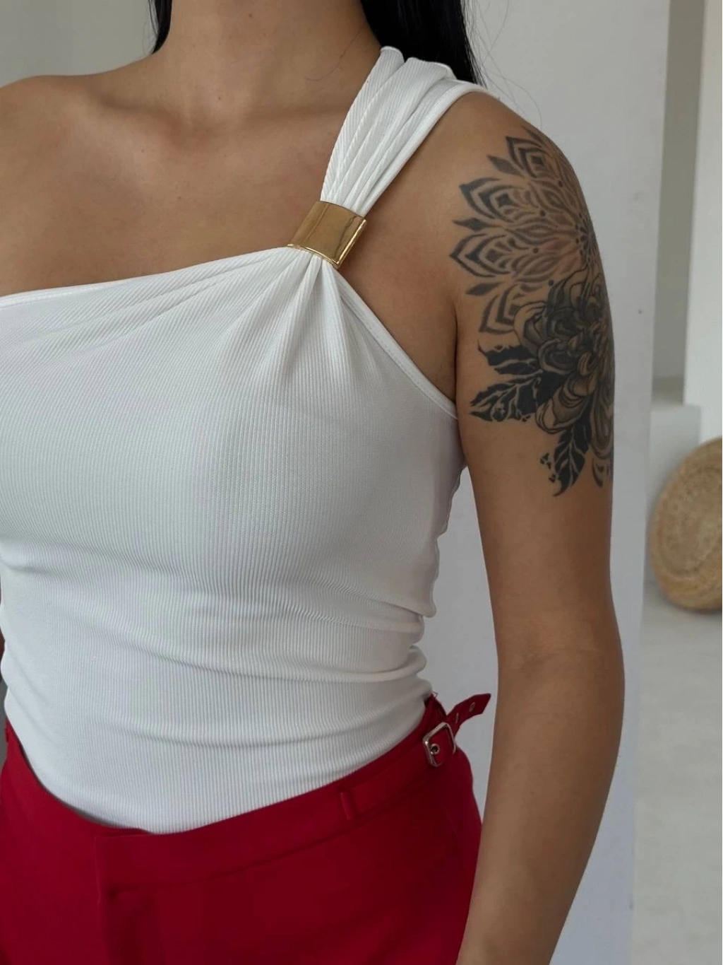 • Tek omuzlu Otoman kumaş gold metal detaylı bluz s2311