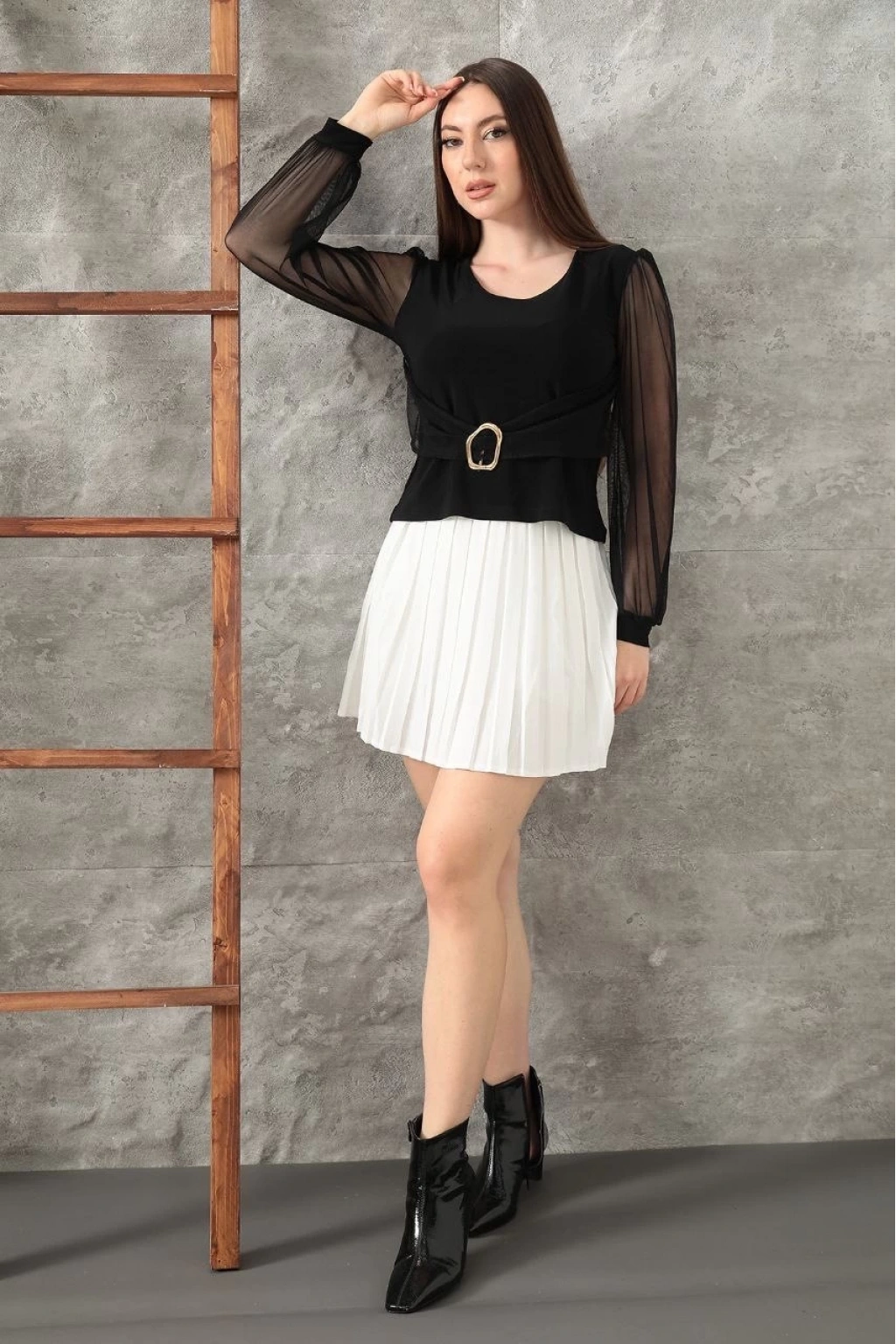 Şıklık ve zarafetin buluştuğu Tokalı Tül Kollu Bluz Siyah T4071, gardırobunuzun vazgeçilmez parçalarından biri olmaya aday!