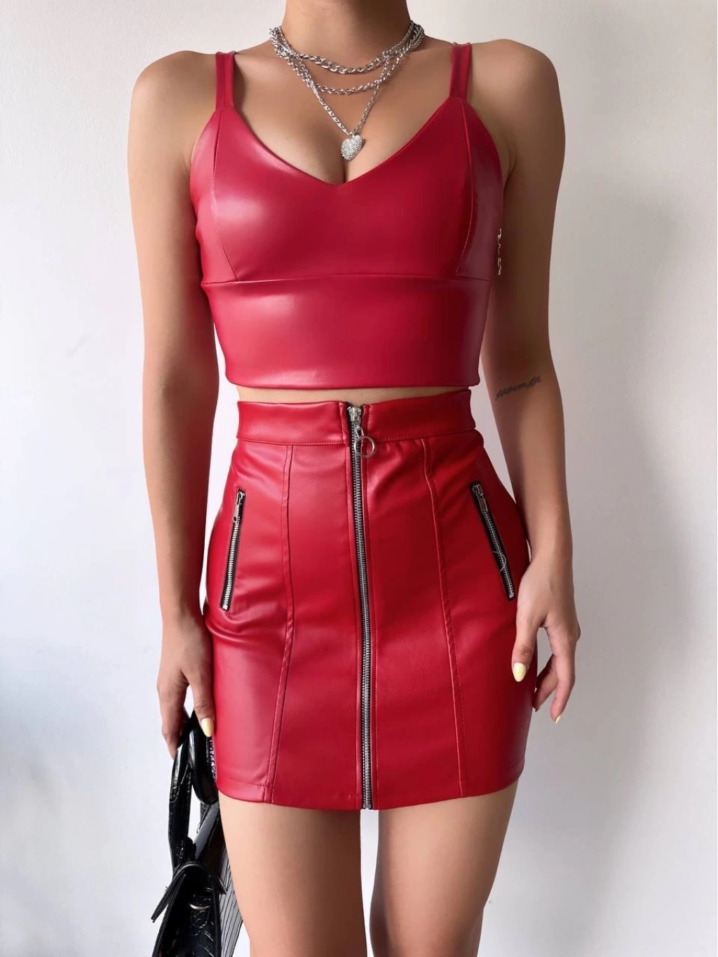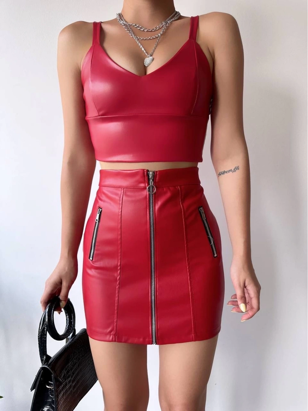 Üç fermuarlı deri etek bordo S24510, şıklığı ve rahatlığı bir arada sunan bir parçadır.