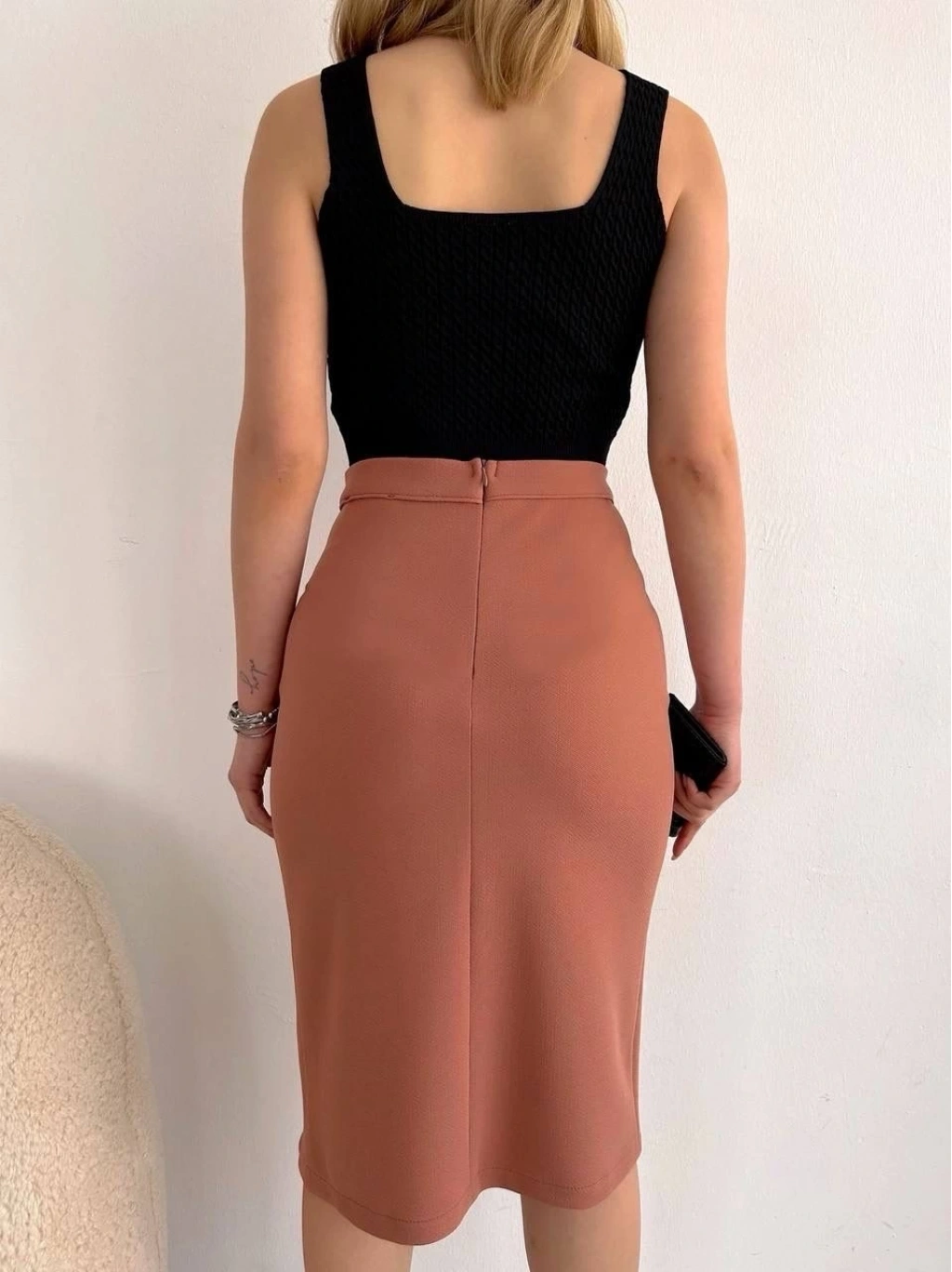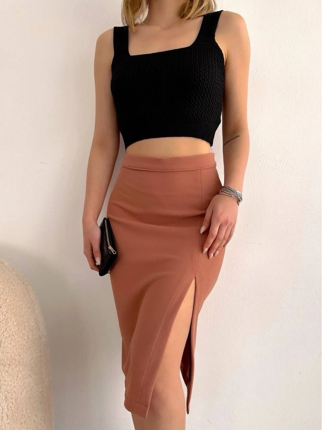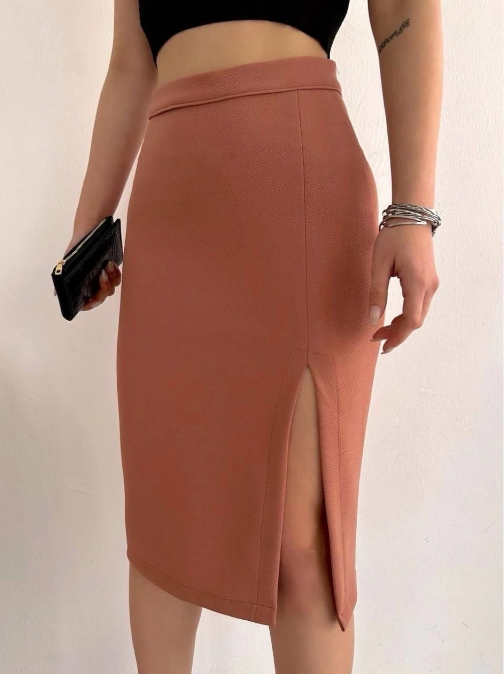 Uzun midi boy yırtmaçlı etek somon s24907, şıklığı ve rahatlığı bir arada sunuyor.