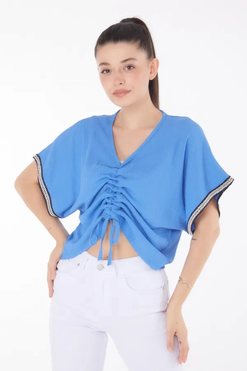 • V yaka büzgülü detaylı bluz
