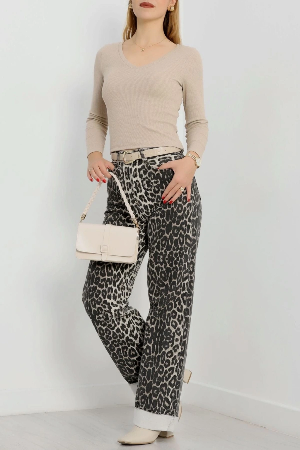 Bej renkli V yaka kaşkorse bluz Sayesinde şıklık ve tarzı bir arada sunuyor.