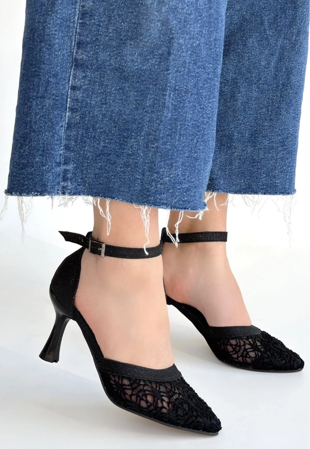 Weja Siyah Cilt Tül Detaylı Simli Topuklu Ayakkabı