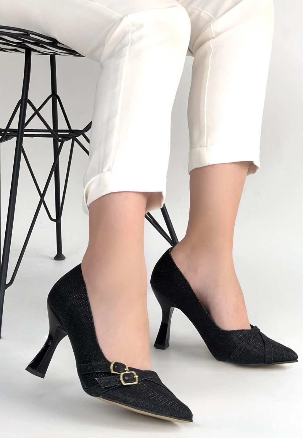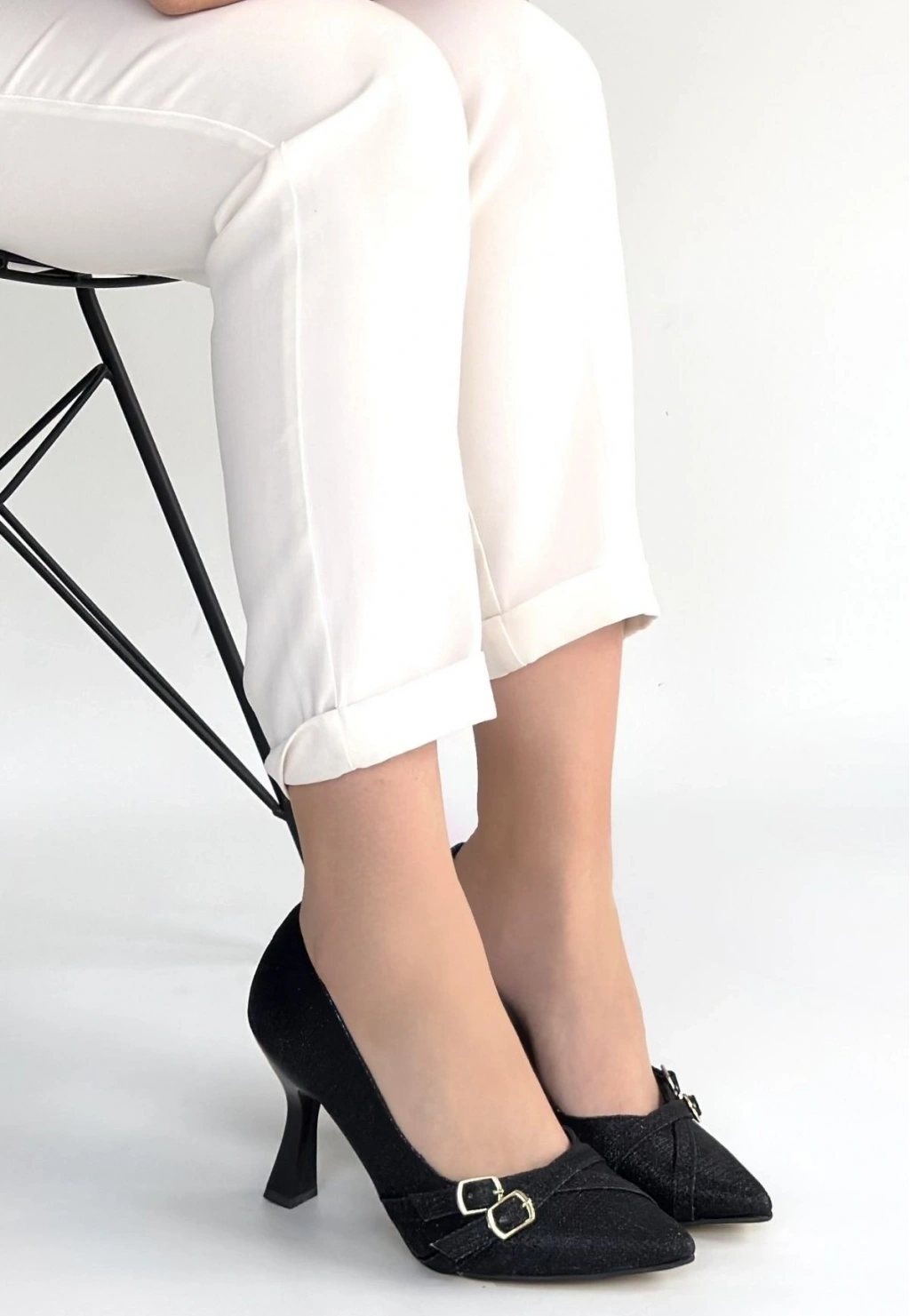 • Wenda Siyah Simli Cilt Topuklu Ayakkabı