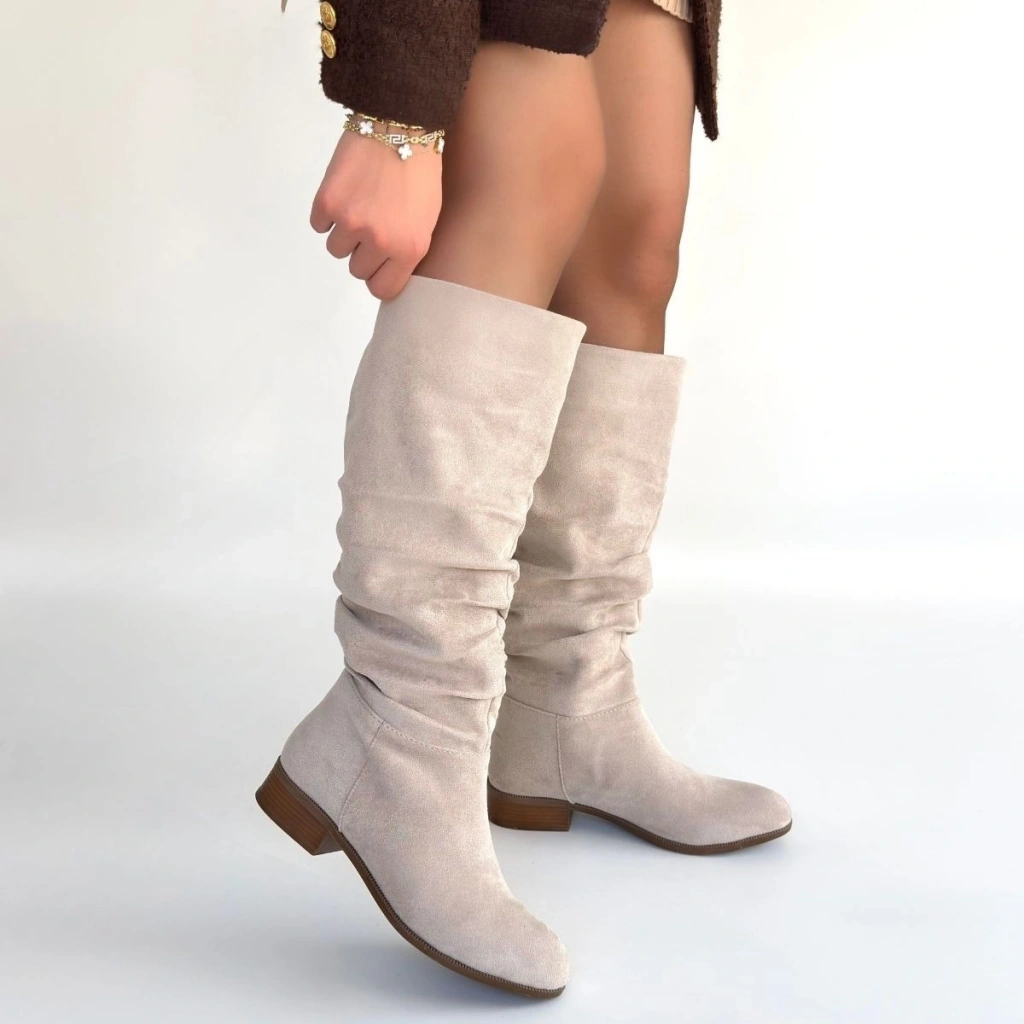 Winda Bej Süet Körüklü Topuklu Çizme