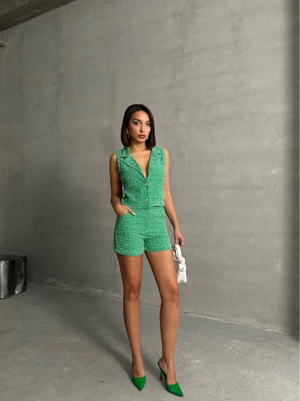 Yelekli şort takım Yeşil, gardırobunuza şıklık ve rahatlık katacak bir seçenektir. Hem şık hem de spor bir görünüm elde etmek isteyen kadınların tercihi olan bu takım, günlük hayatta ve özel günlerde rahatlıkla kullanılabilir. İşte Yelekli şort takım Yeşil'in öne çıkan özellikleri: