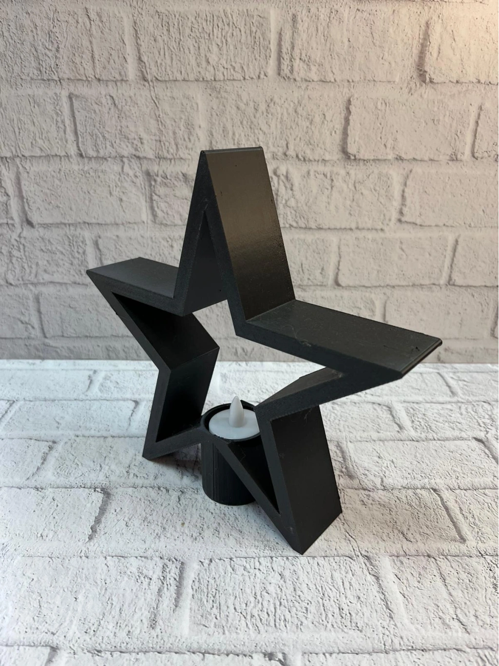 Siyah yıldız mumluk, sade tasarımıyla dekorasyonda güçlü bir etki yaratır. Raf üstü, masa veya köşe alanlarda tek başına kullanıldığında bile dikkat çekici bir görünüm sunar. Mum ışığıyla birleştiğinde sıcak, loş ve davetkâr bir salon ambiyansı oluşturur. Dekoratif ve işlevsel yapısıyla hem ev hem ofis kullanımı için uygundur.
