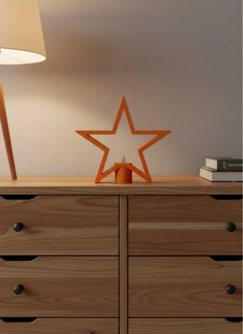 Dekoratif turuncu yıldız mumluk, loş aydınlatma sevenler için estetik ve işlevsel bir ev aksesuarıdır. Raf üstü, masa veya sehpa üzerinde kullanıldığında dekorasyona derinlik ve karakter kazandırır. Mum ışığının yumuşak yansımasıyla salonlarda cozy bir ambiyans oluşturur ve mekâna sıcak bir dokunuş ekler.