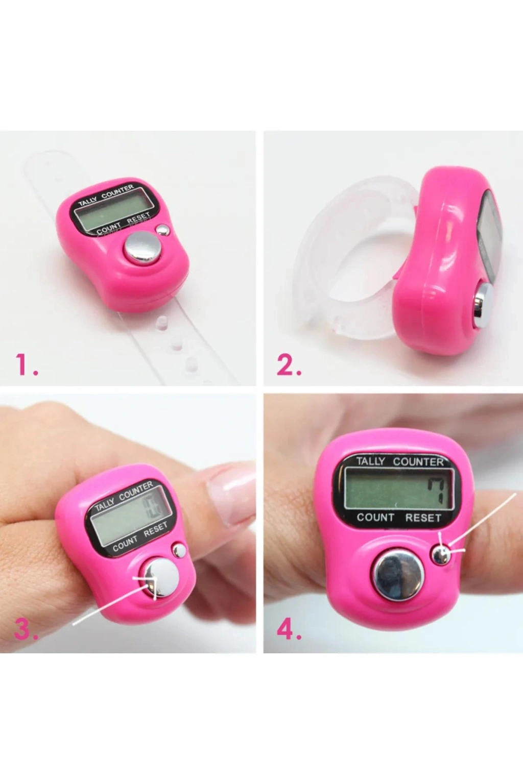 • Parmak Zikirmatik - 99999'a Kadar Sayar - Kullanılmadığı zaman 40 saniyede uyku moduna geçer pil tasarrufu sağlar - Parmağa Yüzük Gibi Takılarak Kullanılır. - KARIŞIKTIR RENK Mevcuttur.