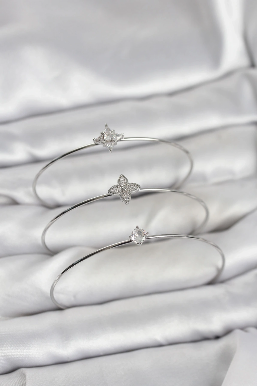 Zirkon Taşlı Gümüş Renk Yonca Model 3'lü Kadın Bileklik Kombini